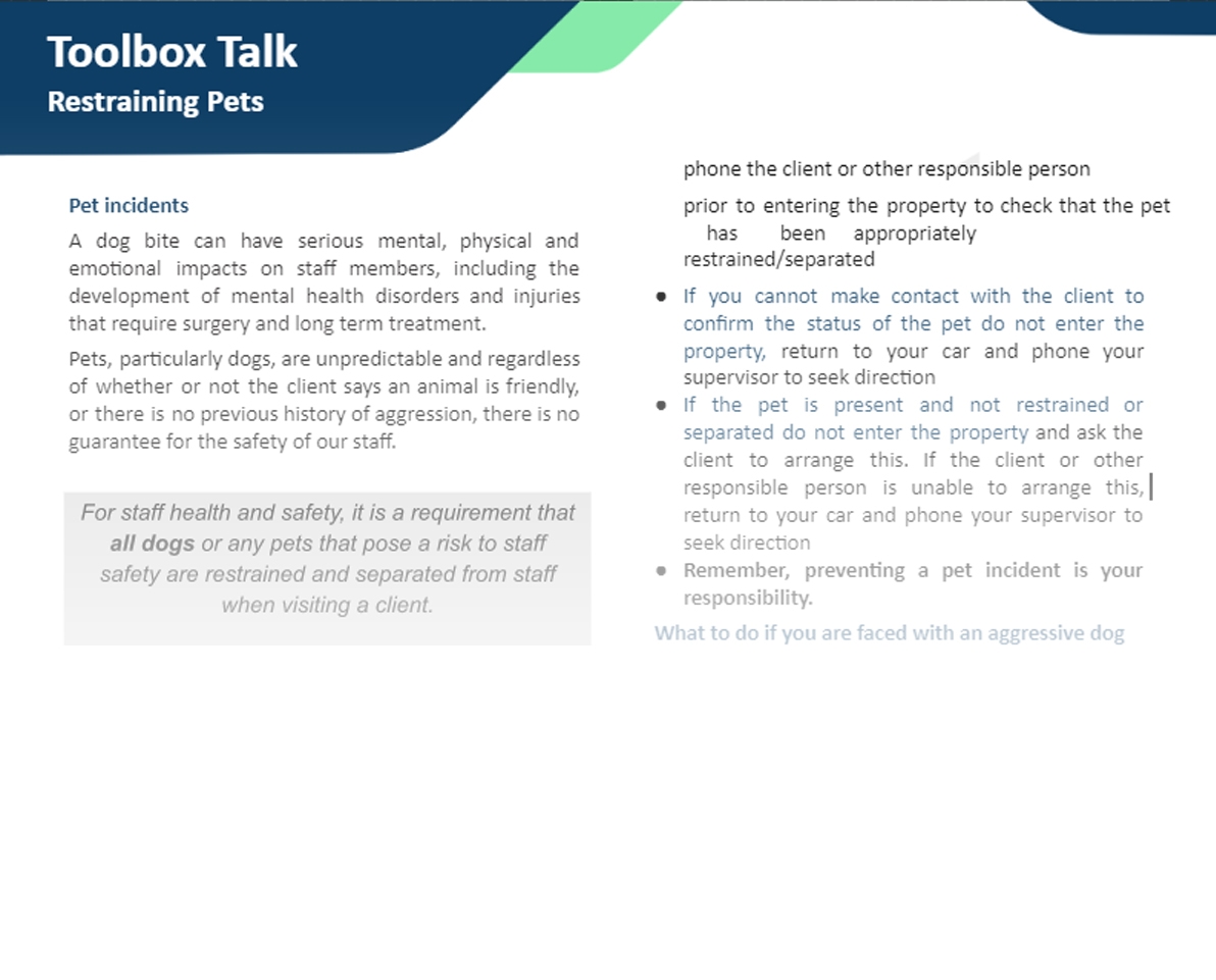 For workplaces with pets, this talk focuses on the safe handling and restraint of animals to prevent bites or injuries. Ensuring pets are securely restrained protects both workers and visitors, creating a safer environment when pets are present in the workplace or on-site.